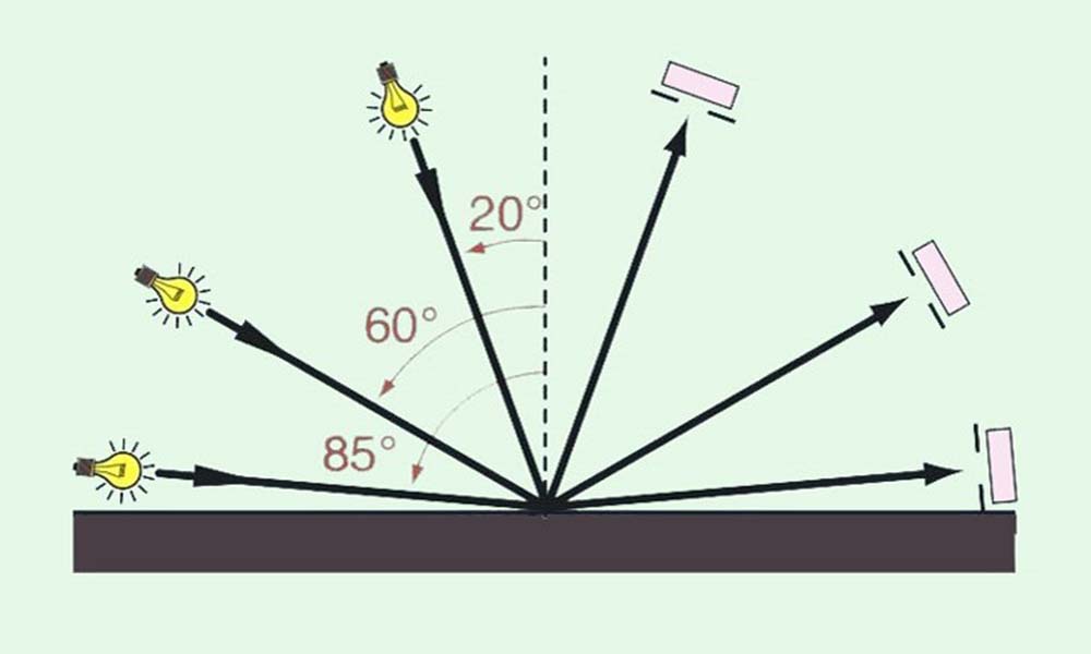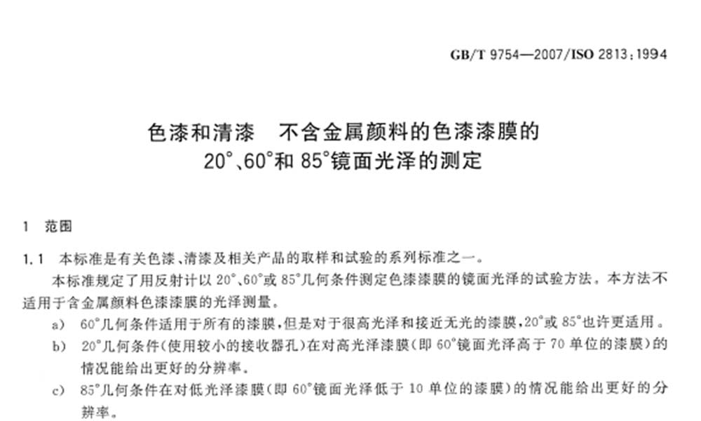 在國家標(biāo)準(zhǔn)GB/T9754-2007中,對(duì)于色漆、清漆、不含金屬顏料的色漆漆膜等的光澤度提出了明確的判定方法,以20°、60°或85°幾何條件來測定。20°、60°、85°三個(gè)測量角度是指與被測物表面垂直的法線與入射光束的夾角。60°適用于所有漆膜,20°更適合高光澤漆膜,即60°鏡面光澤度高于70單位的漆膜,85°適用于低光澤漆膜,即60°鏡面光澤低于10單位的漆膜。一般而言,可用60°的通用角度測量油漆。