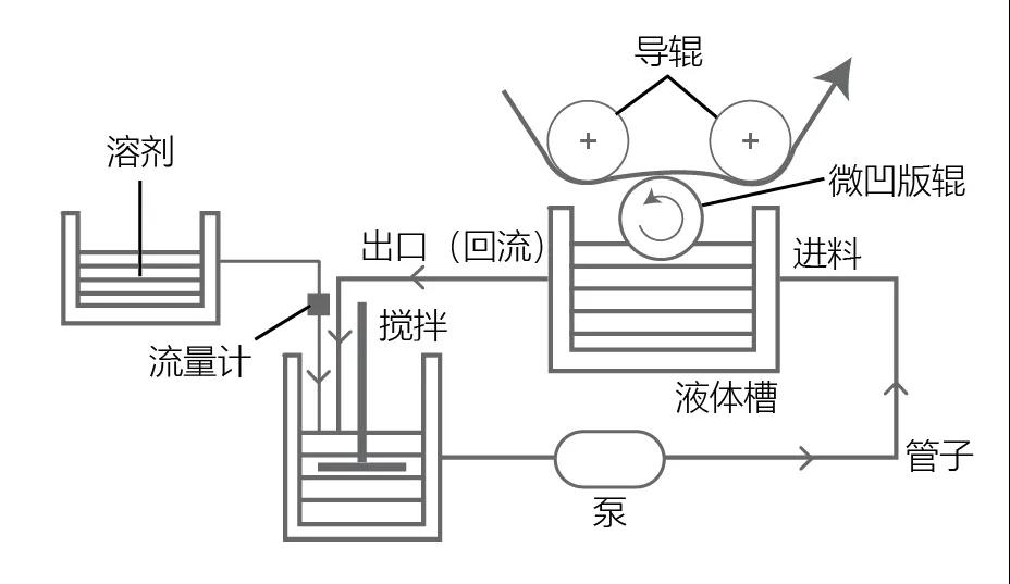 為了解決這個問題,可以在使用微凹的時候,進(jìn)行回流,使得涂布液處于一個流動的狀態(tài),不容易結(jié)皮,同時在回流的時候根據(jù)溶劑的揮發(fā)速率進(jìn)行溶劑的補(bǔ)充,從而進(jìn)一步降低溶劑揮發(fā)所帶來的影響。
